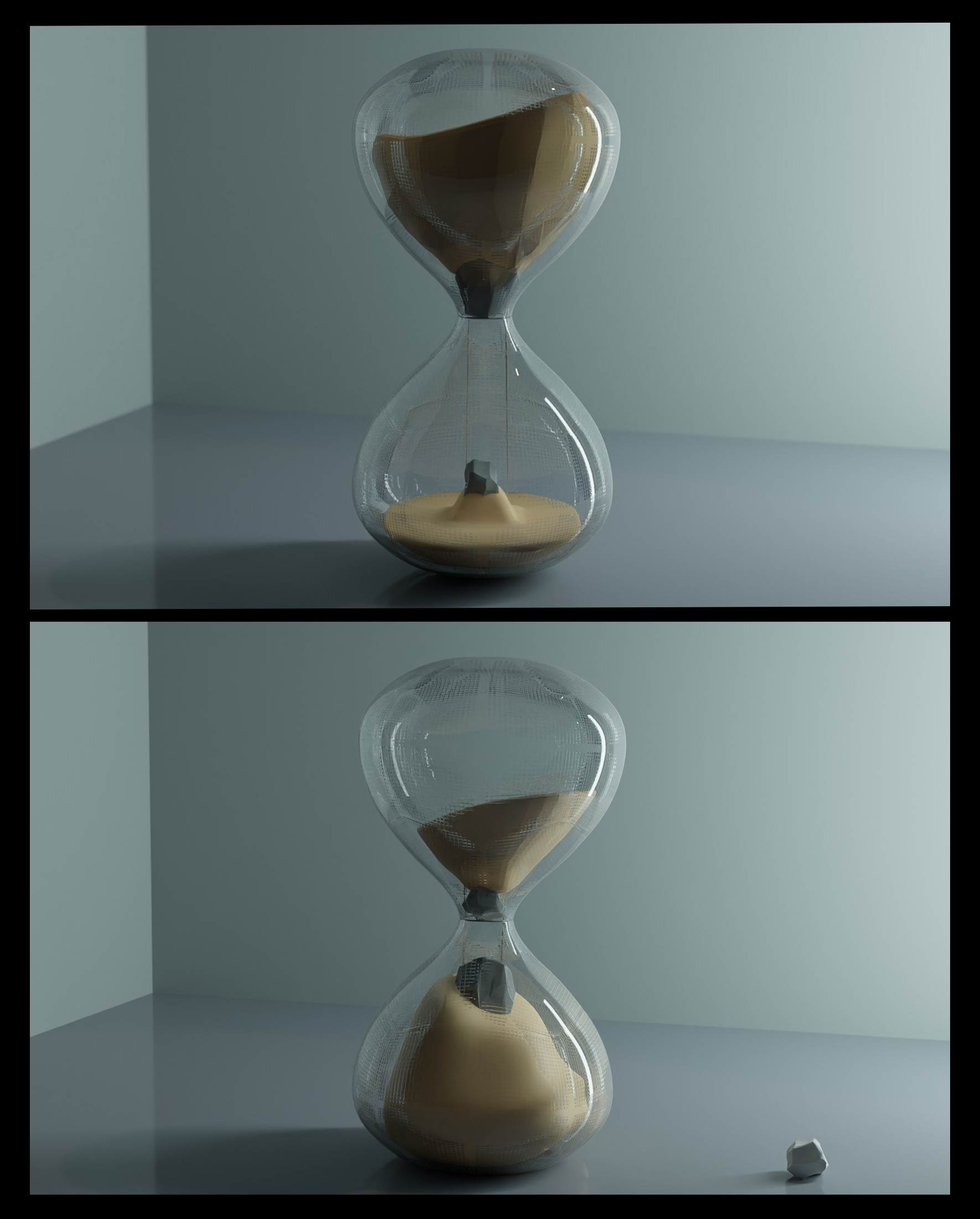 In the usage of the hourglass, it creates a binary relationship. At a glance, it portrays Fatherhood's sake in supporting me. On the other hand, blocking the sand can prevent my maturity, leading to a lack of independence. As time flows, one side shows a rigid boulder appearing indestructible, symbolizing unconditional love and support. On the flip side, the other side is a smaller boulder. It represents the moment when I should demonstrate my strength without my father's support, repaying all the love he gave me. The small boulder outside the hourglass represents myself projecting the Anima—seeing the whole phenomenon as a third person. Thus, by integrating my desires into conscious life, moving away from fulfilling my father's desires while still appreciating them, I project more of my subjective values.