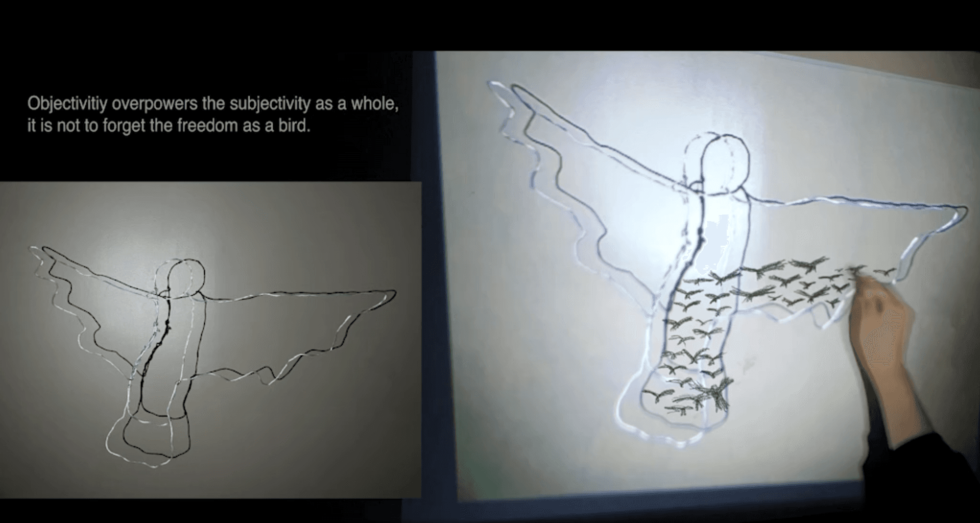 In the usage of the hourglass, it creates a binary relationship. At a glance, it portrays Fatherhood's sake in supporting me. On the other hand, blocking the sand can prevent my maturity, leading to a lack of independence. As time flows, one side shows a rigid boulder appearing indestructible, symbolizing unconditional love and support. On the flip side, the other side is a smaller boulder. It represents the moment when I should demonstrate my strength without my father's support, repaying all the love he gave me. The small boulder outside the hourglass represents myself projecting the Anima—seeing the whole phenomenon as a third person. Thus, by integrating my desires into conscious life, moving away from fulfilling my father's desires while still appreciating them, I project more of my subjective values.